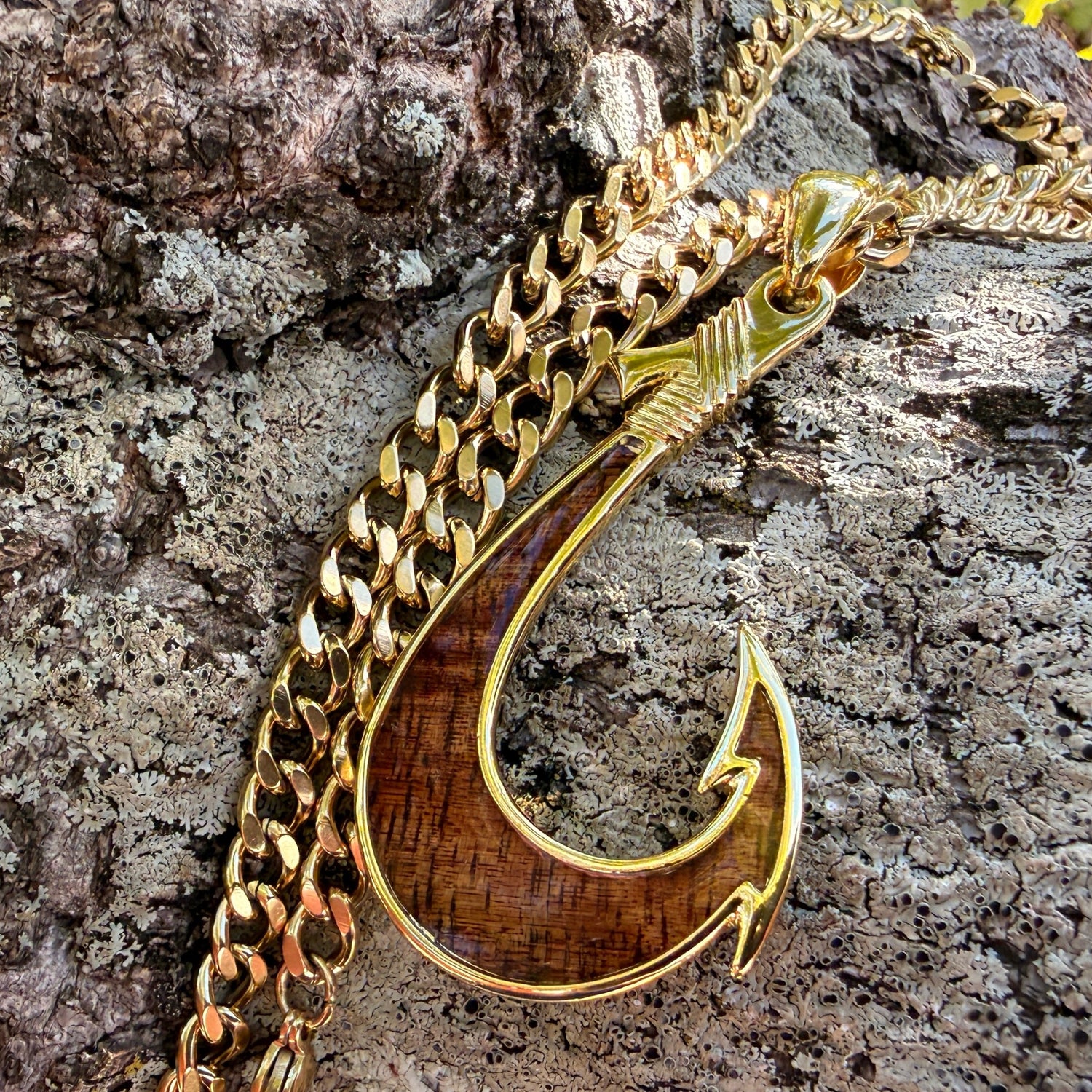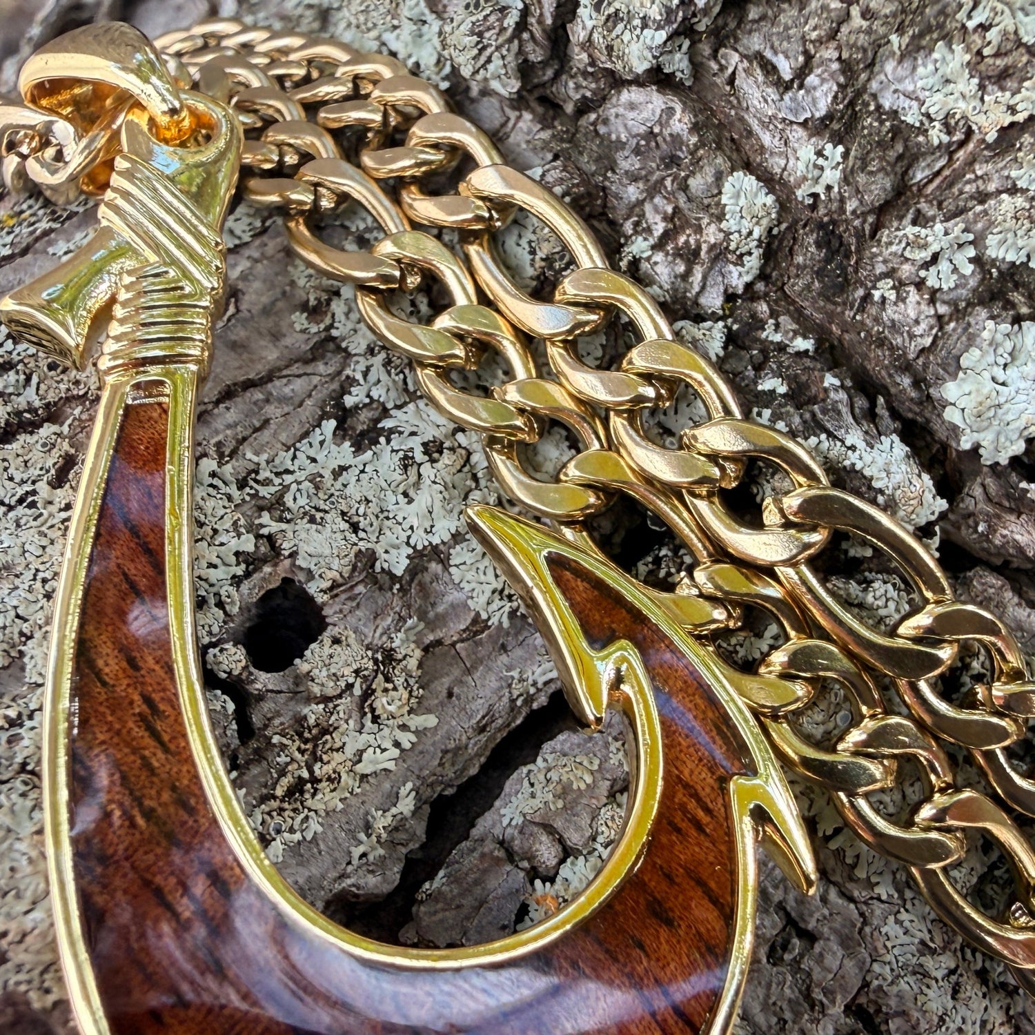 Check out our latest Showcase Hawaii original Fish Hook design! This is a stunning piece to add to your Fish Hook collection and you can only get it at Showcase Hawaii because we designed it. Koa wood on one side and hand engraved Hawaiian scroll design on the other make this truly special. 14K Gold plated or Silver Plated over brass and includes a chain.
