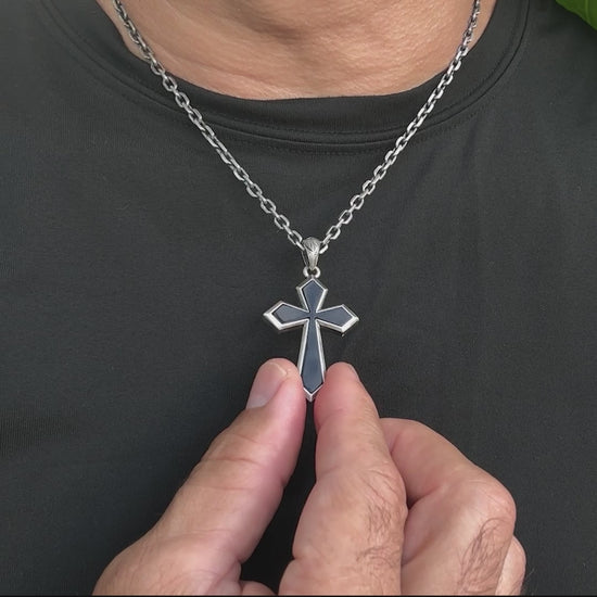 The Mana Onyx & Silver Cross exemplifies refined craftsmanship with its construction in solid .925 sterling silver and elegant black onyx inlay. An engraved Hawaiian Scroll Bale gently cradles the chain. The understated oxidized matte finish enhances its timeless appeal, while its substantial 2" x 1" dimensions establish a commanding presence. Complete with a 20" 4MM link chain and lobster claw clasp, this distinguished pendant serves as a versatile foundation for any discerning jewelry collection.